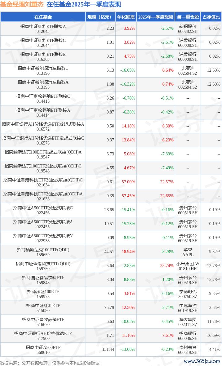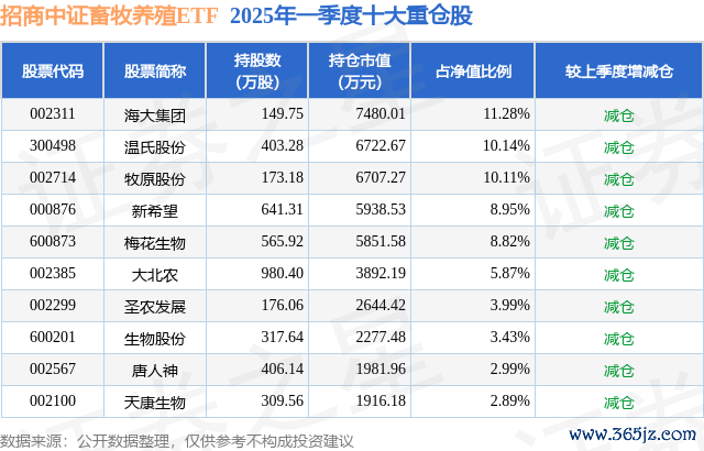 从基金规模来看,招商中证畜牧养殖ETF基金2025年一季度公布的基金规模为6.63亿元,较上一期规模6.72亿元变化了-861.86万元,环比变化了-1.28%。该基金最新一期资产配置为:股票占净值比99.3%益配资,无债券类资产,现金占净值比0.86%。从基金持仓来看,该基金当季前十大股票仓位达68.47%,第一大重仓股为海大集团(002311),持仓占比为11.28%。