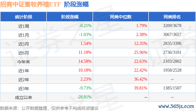 从业绩表现来看,招商中证畜牧养殖ETF基金过去一年净值涨幅为-1.41%,在同类基金中排名1934/2216,同类基金过去一年净值涨幅中位数为11.09%。而基金过去一年的最大回撤为-30.43%,成立以来的最大回撤为-48.53%。