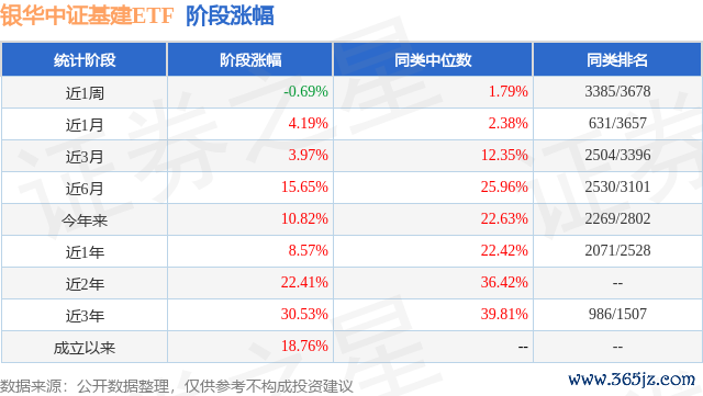 从基金规模来看,银华中证基建ETF基金2025年一季度公布的基金规模为5.86亿元,较上一期规模6.29亿元变化了-4246.55万元,环比变化了-6.75%。该基金最新一期资产配置为:股票占净值比97.91%,无债券类资产,现金占净值比2.16%。从基金持仓来看,该基金当季前十大股票仓位达57.61%,第一大重仓股为中国建筑(601668),持仓占比为9.03%。