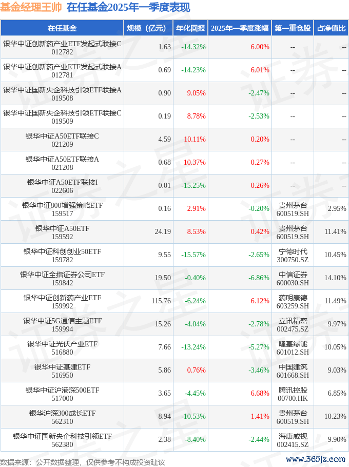 银华中证基建ETF现任基金经理为王帅。其中在任基金经理王帅已从业5年又300天,2021年4月29日正式接手管理银华中证基建ETF,任职期间累计回报为3.06%。目前还管理着18只基金产品(包括A类和C类),其中本季度表现最佳的基金为银华中证沪港深500ETF(517000),季度净值涨幅为6.68%。